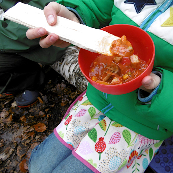 An einer Outdoor-Feuerstelle kochen wir eine Räubersuppe. Wer seinen Löffel fertig hat, kann damit schon die Suppe auslöffeln.